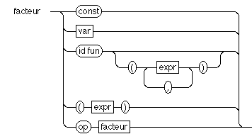 Les facteurs qui constituent les opérandes d'une expression peuvent être des constantes, des variables, ou des appels de fonction. Ainsi, si l'on ne tient pas compte des priorités, la syntaxe des expression peut se décrire comme suit :