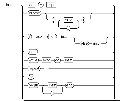 De plus, des instructions peuvent être groupées dans un bloc (begin-end en Pascal). Le diagramme syntaxe des instructions Pascal est le suivant :