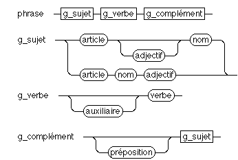 Cette notation correspond à la description d'une grammaire de production. Chaque ligne correspond à une règle de production. Les noms entre chevrons (comme <phrase>) sont appelés non-terminaux. Les autres sont les terminaux, c'est-à-dire des mots du vocabulaire. Pour construire une phrase grammaticalement correcte, il faut construire un arbre dont la racine est le non-terminal à gauche de la première règles et dont les fils sont les terminaux et non-terminaux de la partie droite. Chaque feuille de l'arbre qui est un non-terminal doit être complétée en utilisant une règle dont le non-terminal est en partie gauche. Il faut noter que dans cet exemple, on peut produire des phrases "insensées". Dans les règles de production ci-dessus, les crochets permettent de mentionner des parties optionnelles et les barres verticales des alternatives.
