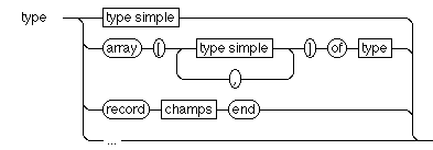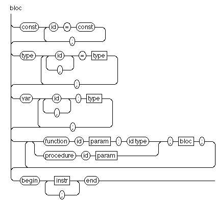 Les déclarations de constantes, types, variables, fonctions et procédures sont toutes optionnelles. Elles font référence aux déclarations de type décrites ci-dessous :