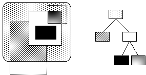 Une extension de ce modèle est le modèle hiérarchique. Dans ce modèle, chaque fenêtre peut contenir des (sous-)fenêtres. L'écran lui-même est considéré comme une fenêtre (dans laquelle on peut dessiner, comme les autres fenêtres). L'écran est la racine de l'arbre de fenêtres, il est créé à l'initialisation par le système de fenêtrage et il ne peut être détruit. Chaque fenêtre n'est visible que dans la partie visible de sa fenêtre parente. On a donc une inclusion géométrique des sous-fenêtres dans leur fenêtre parente (figure ci-dessous). Les coordonnées d'une fenêtre sont relatives à la fenêtre parente, de telle sorte que si l'on déplace la fenêtre parente, le sous-arbre suit.