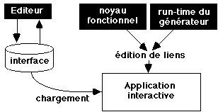 Il est ainsi possible de produire une application interactive de deux façons : soit l'application charge la description de l'interface produite par l'éditeur (figure A), soit elle intègre le code produit par le compilateur (figure B).