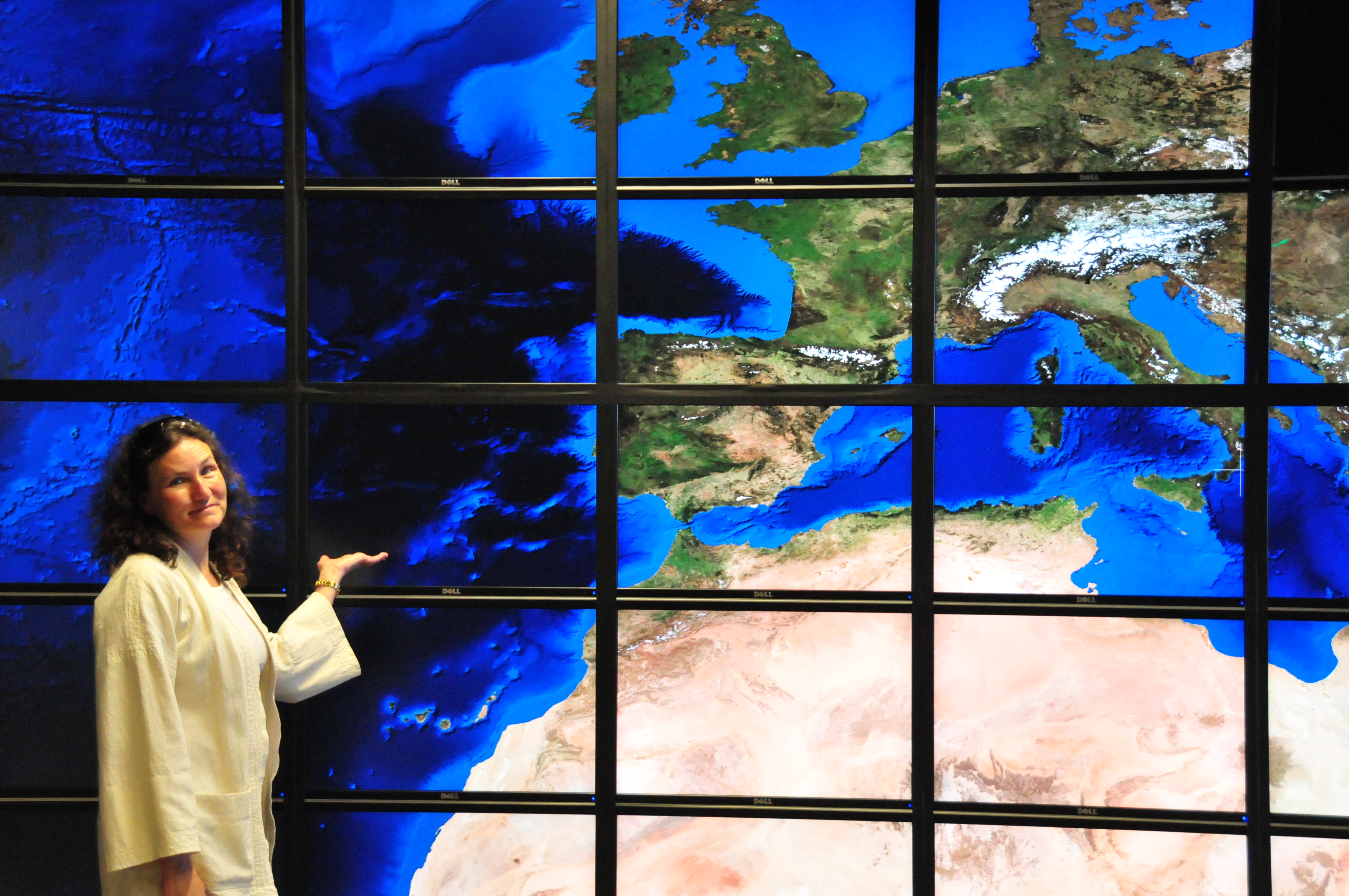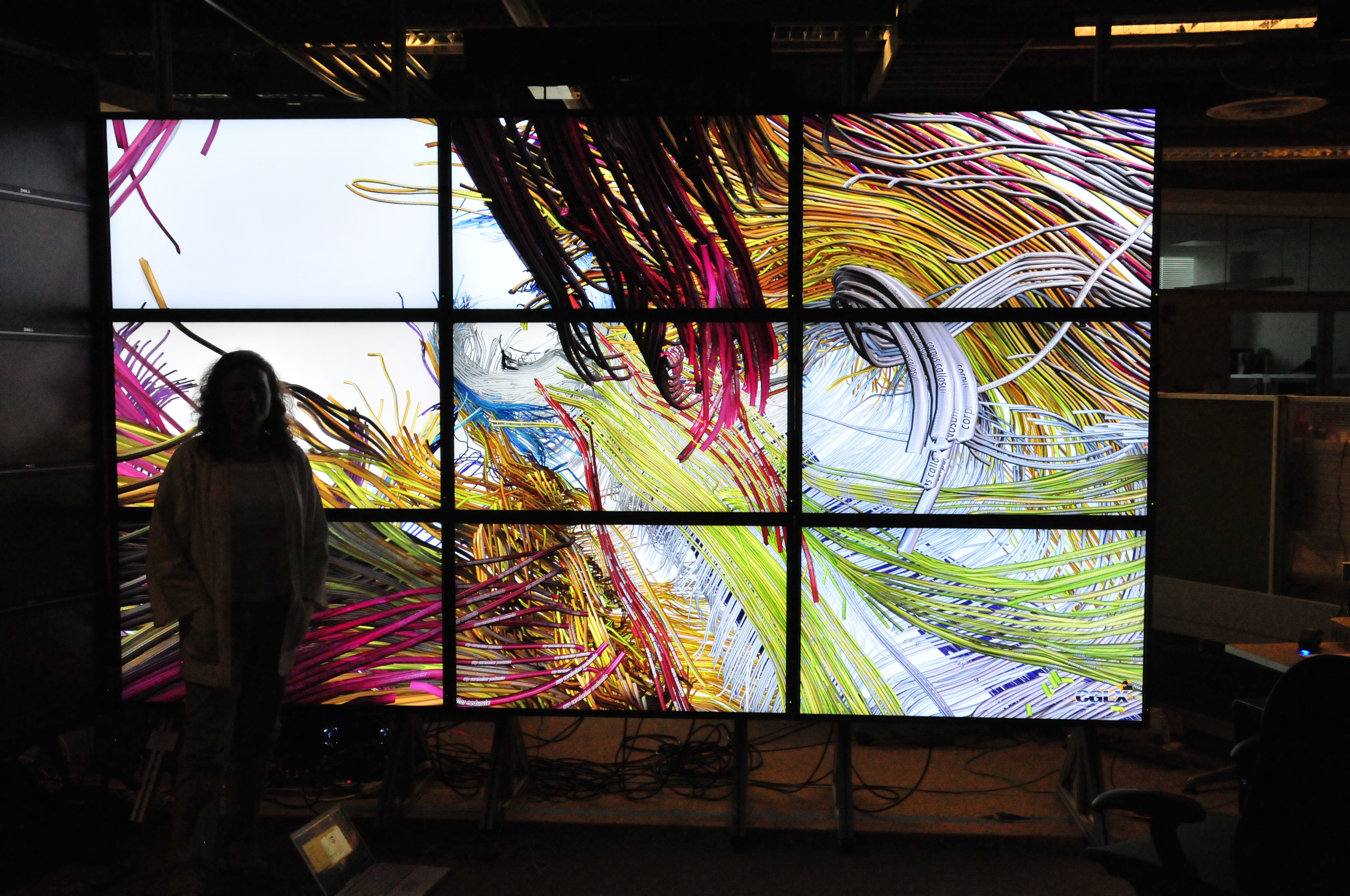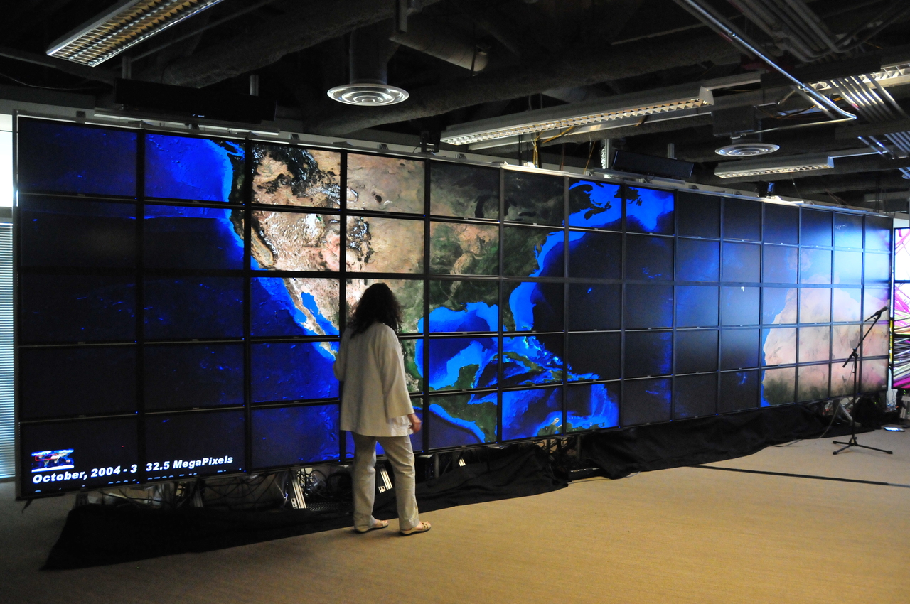 Wendy walking along the HiPerSpace wall. 5 x 14 = 70 monitors. [DSC_3360]