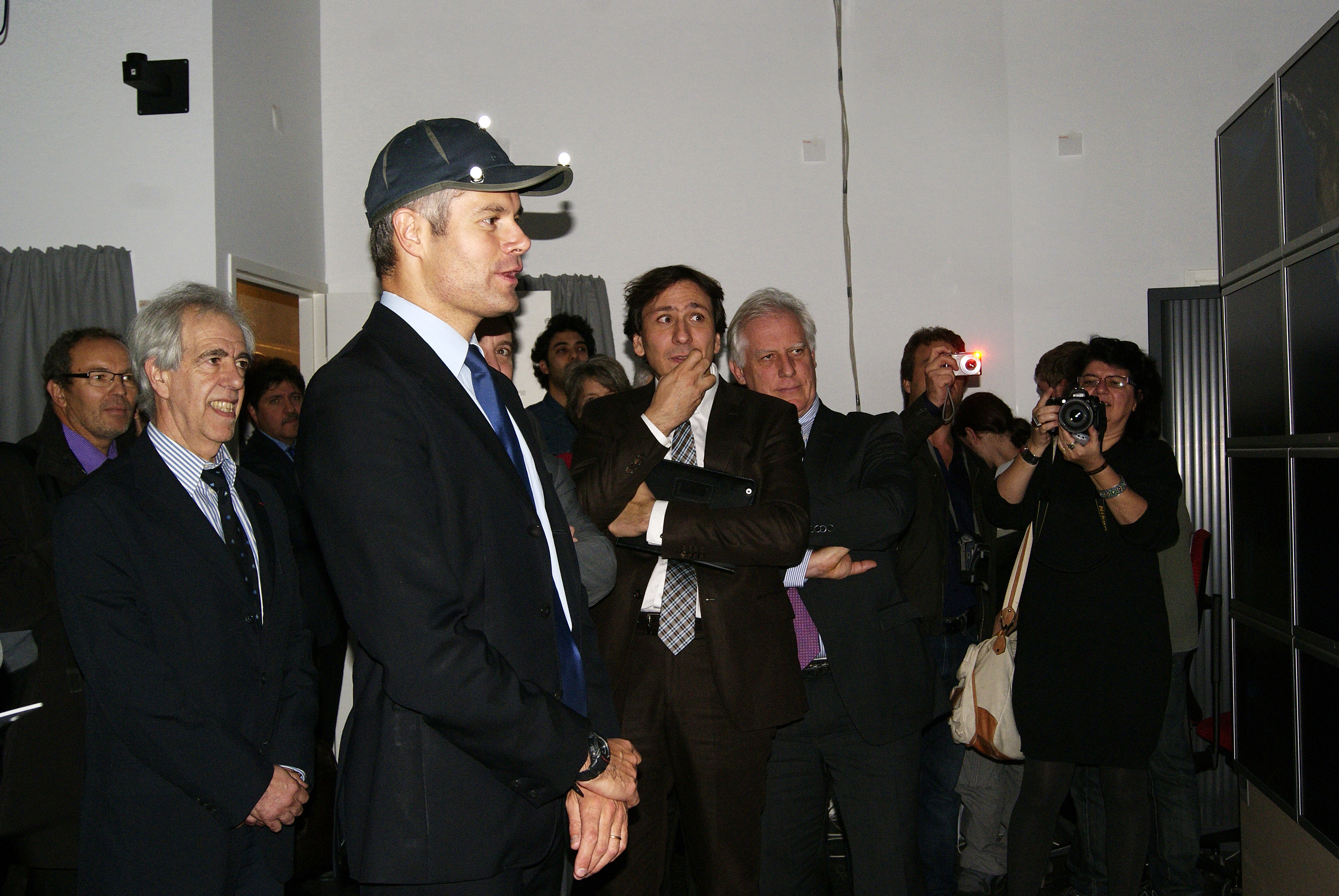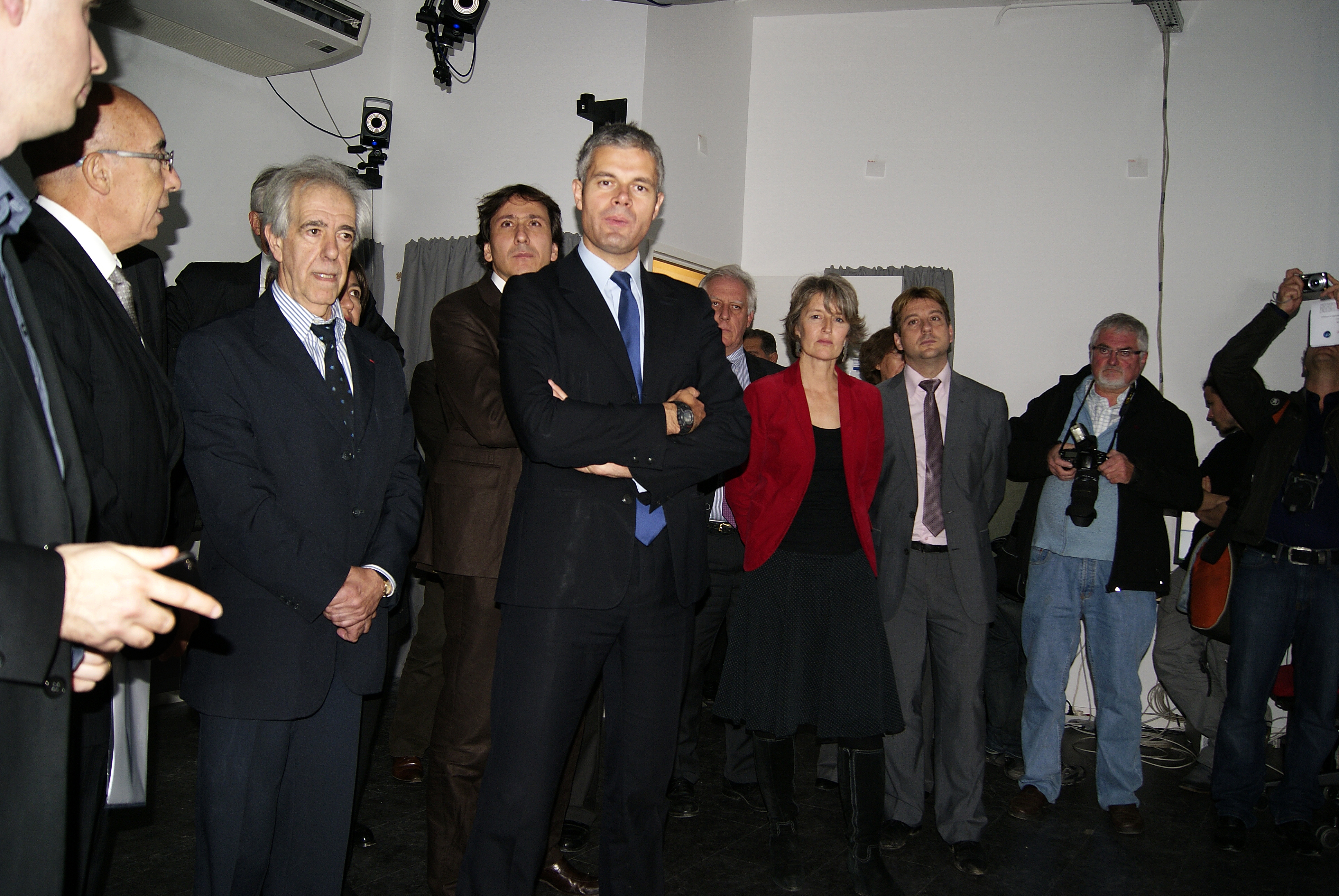 Press conference: Laurent Wauquiez giving his speech. Marie-Claude Gaudel, Michel Cosnard, ??, Guy Couarraze (right). [DSC5171]