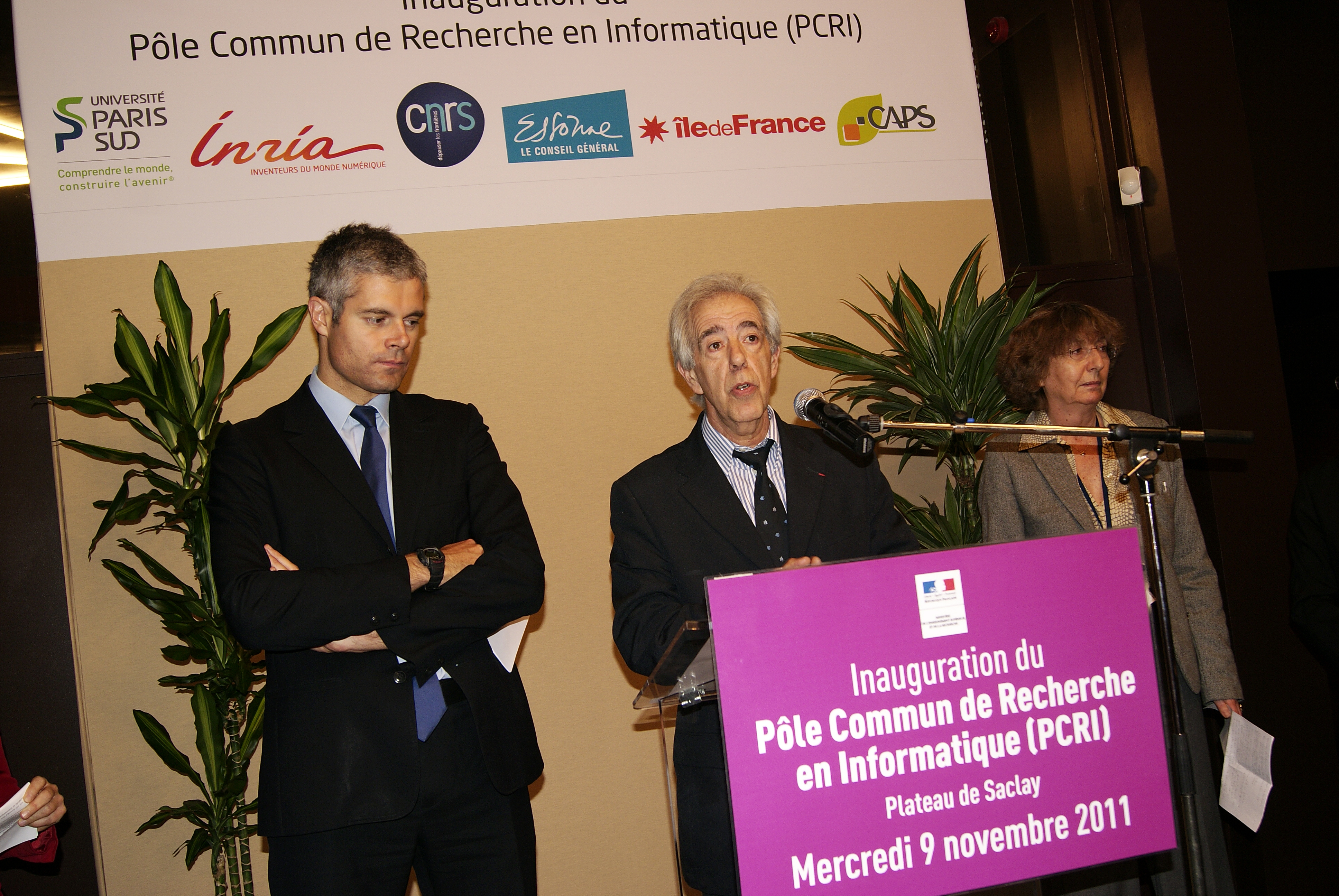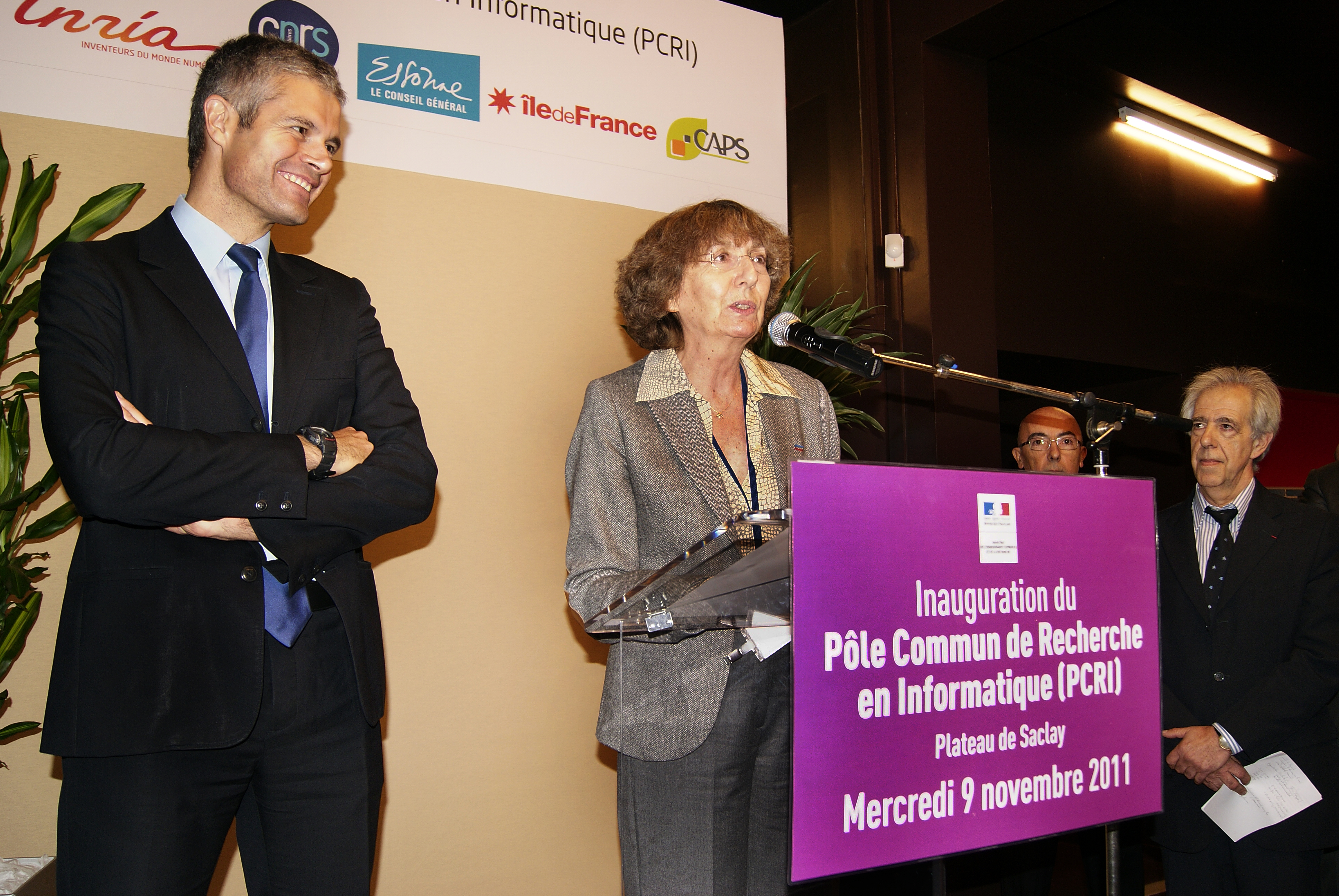 Press conference: Marie-Claude Gaudel giving her speech. Laurent Wauquiez (left), Michel Cosnard and Guy Couarraze (right). [DSC5090]