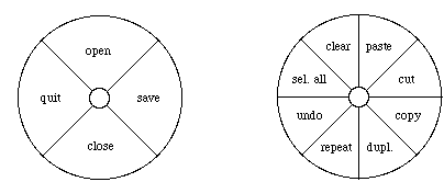 Un menu circulaire est un menu surgissant (ou menu "pop-up") qui apparaît sur l'enfoncement d'un bouton. Il peut avoir 4 ou 8 entrées. Pendant que le bouton est enfoncé, le secteur sous le curseur est mis en inversion video. Si le bouton est relâché alors que le curseur est sur le rond central ou à l'extérieur du menu, aucune commande n'est activée. Si le bouton est relâché sur un secteur, la commande correspondante, s'il y en a une, est activée. Dans tous les cas, le menu disparaît lorsque l'on relâche le bouton (on ne considère pas le cas des menus hiérarchiques).