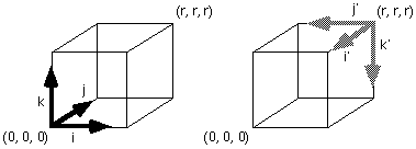 On considère un cube de côté r, dont l'un des coins est à l'origine. Le but de l'exercie est de transformer ce cube de telle sorte que l'origine (0, 0, 0) et le coin qui lui est diamétralement opposé (r, r, r) échangent leurs positions (voir figure ci-dessous).