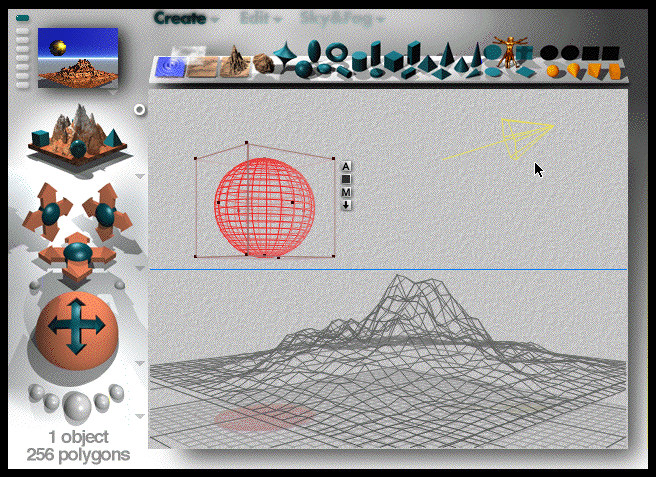 La scène est éditée au centre. Les objets pouvant être ajoutés sont en haut. Les outils pour manipuler la sc&ene sont sur le côté gauche. On note également une prévisualisation du résultat en haut à gauche.
