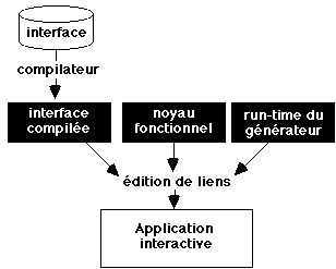 Il est ainsi possible de produire une application interactive de deux façons : soit l'application charge la description de l'interface produite par l'éditeur (figure A), soit elle intègre le code produit par le compilateur (figure B).