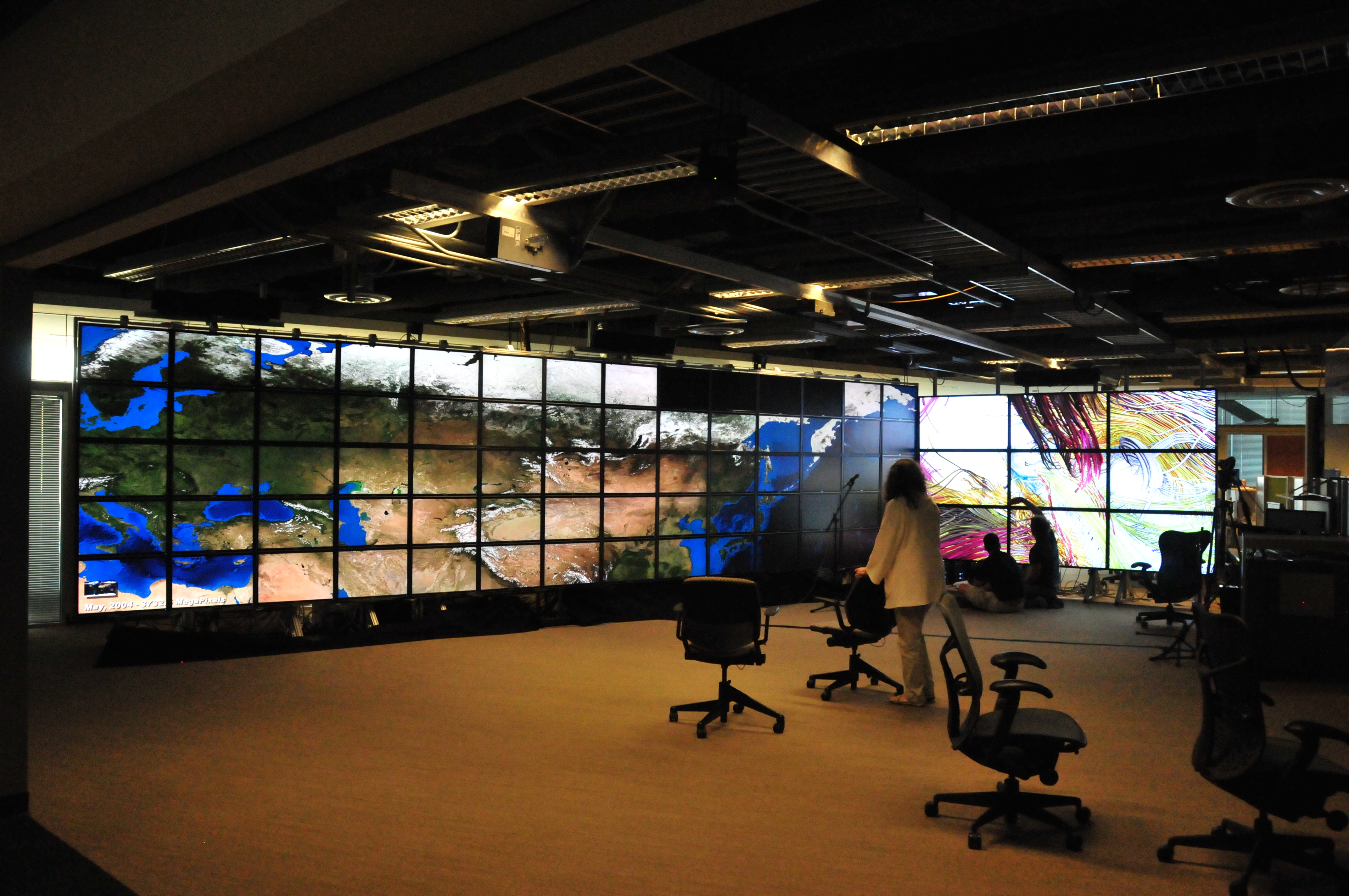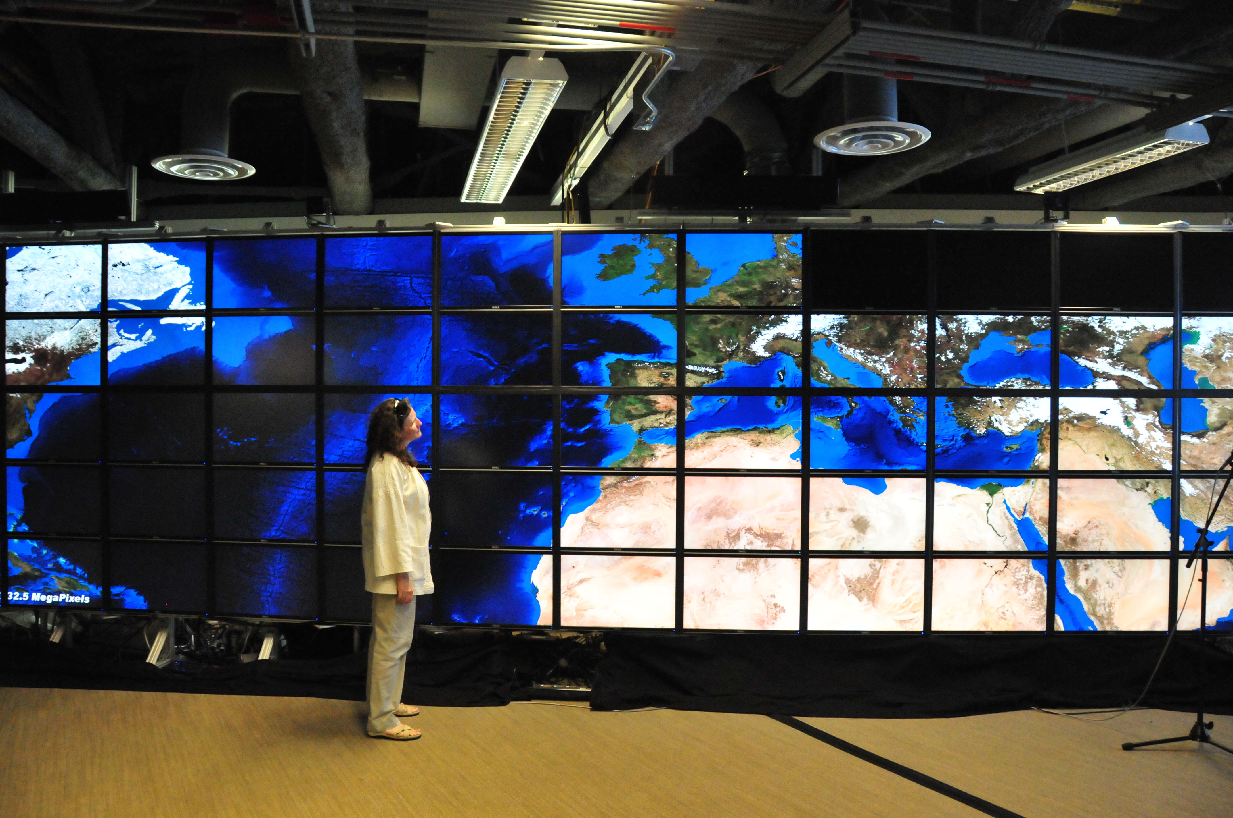 Wendy walking along the HiPerSpace wall. 5 x 14 = 70 monitors. [DSC_3360]