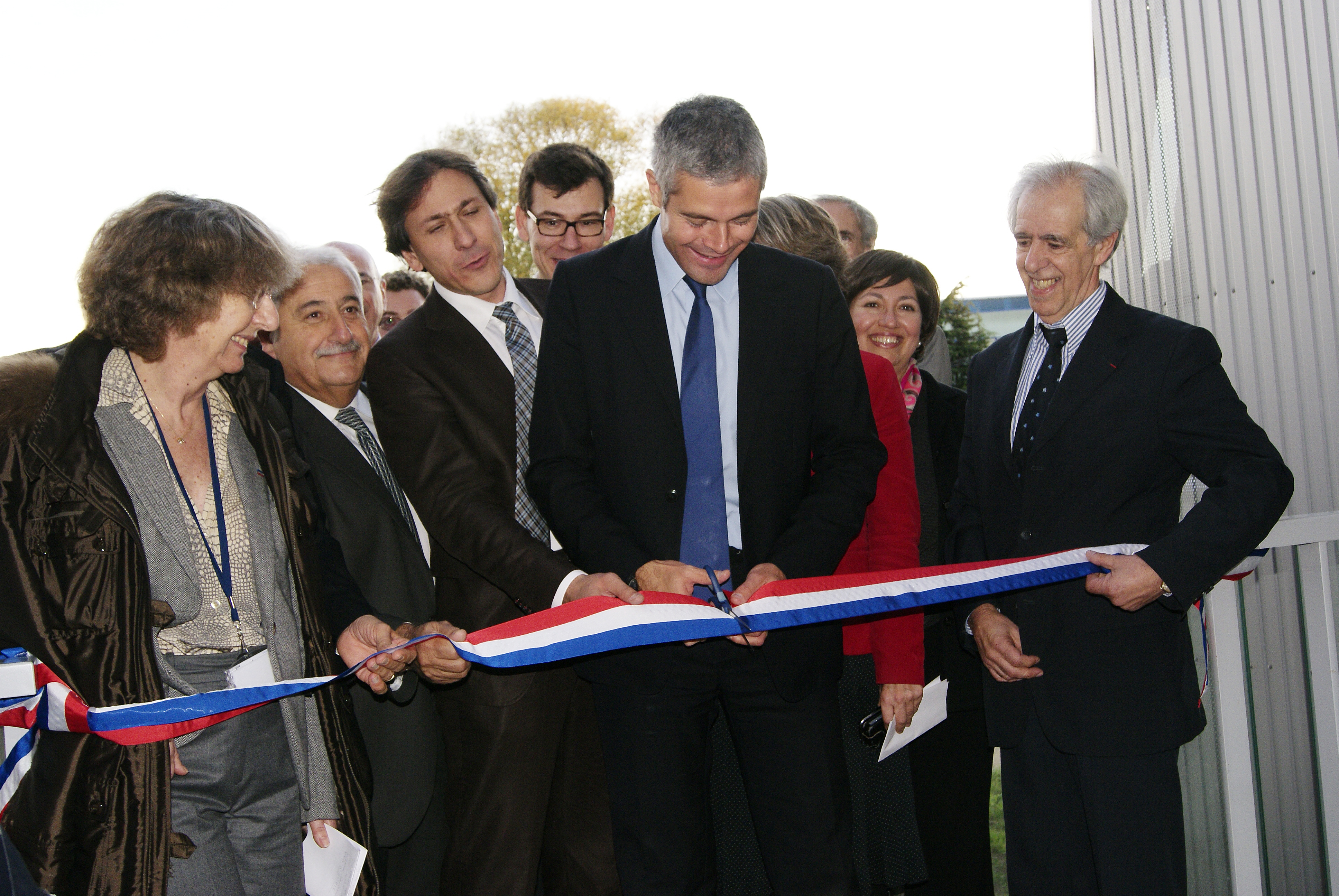Laurent Wauquiez, Minister of Research, cutting the ribbon to inaugurate the PCRI building. Left to right (front row): Marie-Claude Gaudel, Pierre Lasbordes, Jérôme Guedj, Laurent Wauquiez, Guy Couarraze. [DSC5008]
