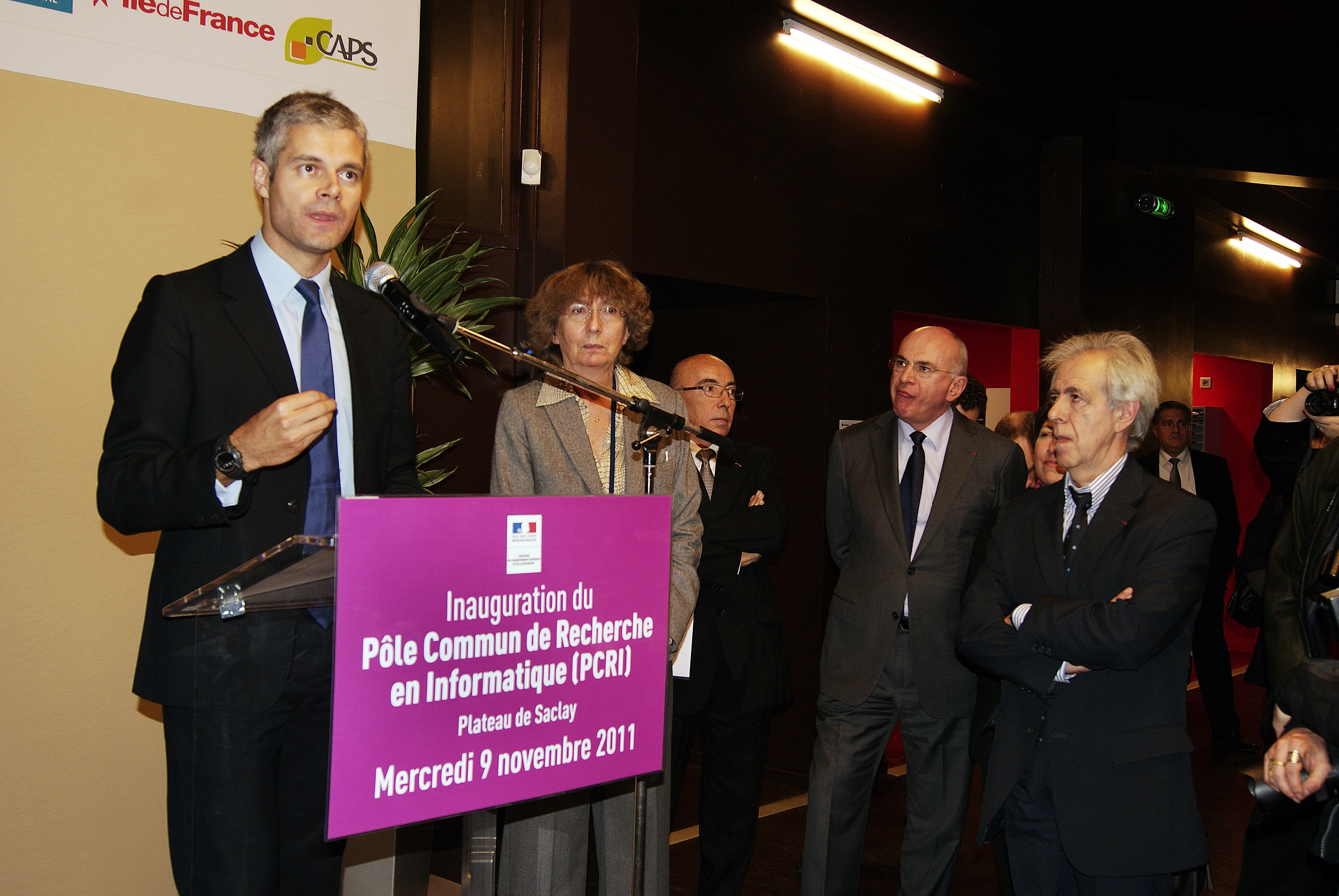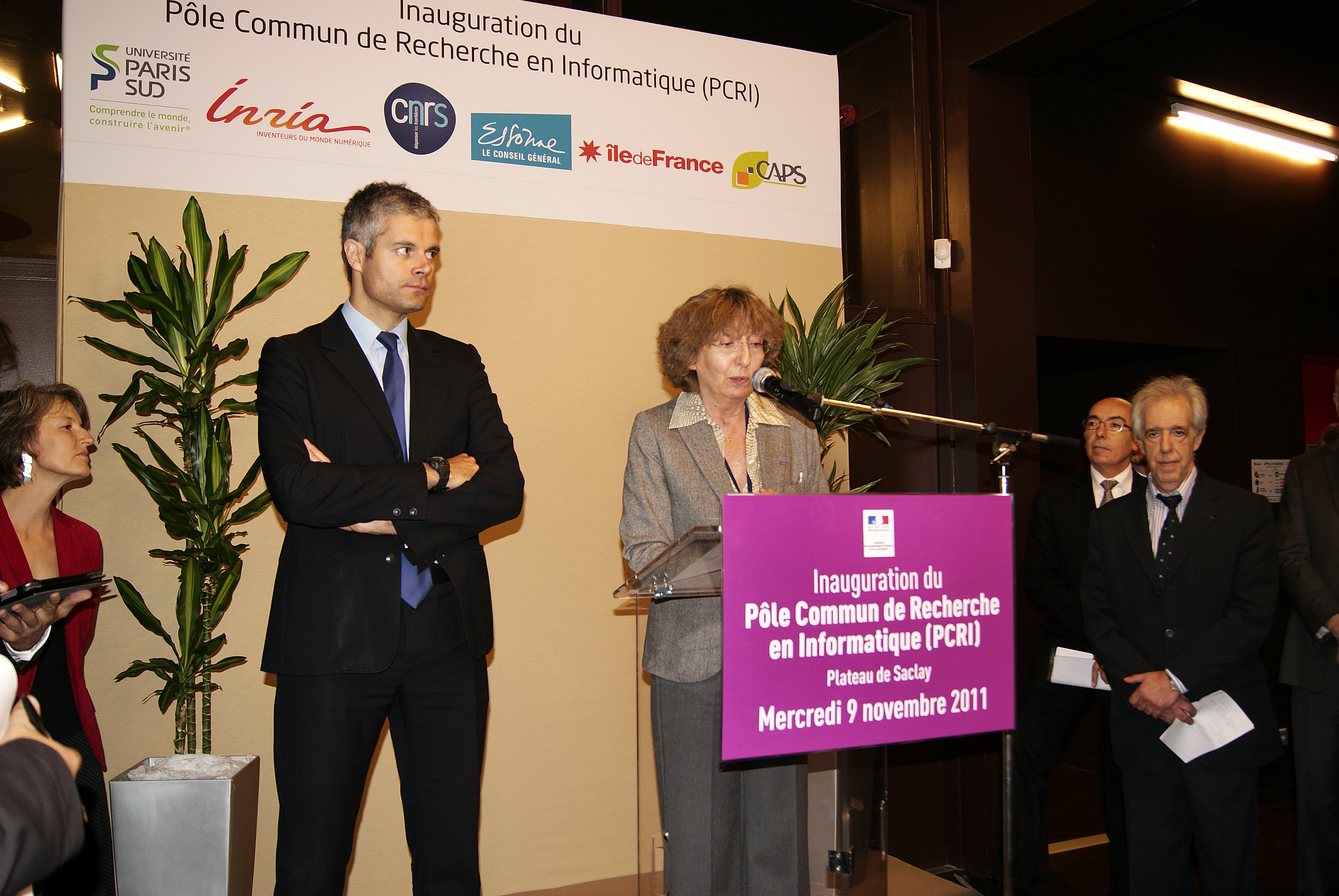 Press conference: Laurent Wauquiez giving his speech. Marie-Claude Gaudel, Michel Cosnard, ??, Guy Couarraze (right). [DSC5171]