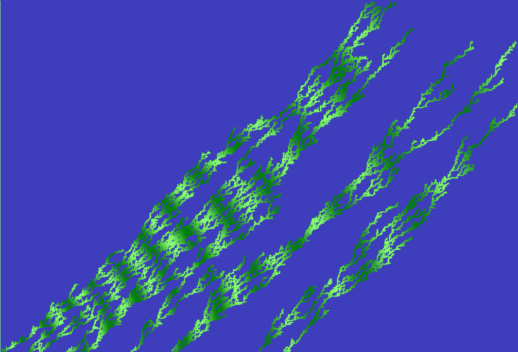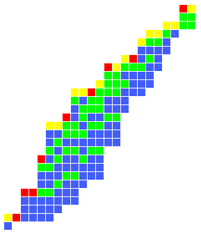 An `aesthetic attempt'' (please be indulgent!) with directed animals, by Alain Denise and Nadine Rouillon in 1992 with Barcucci-Pinzani-Sprugnoli algorithm and CalICo.Une ``tentative esthétique'' (à vous de juger du résultat!) à base d'animaux dirigés. Engendrés par Alain Denise et Nadine Rouillon en 1992 avec l'algorithme de génération de Barcucci, Pinzani et Sprugnoli et le logiciel CalICo. |