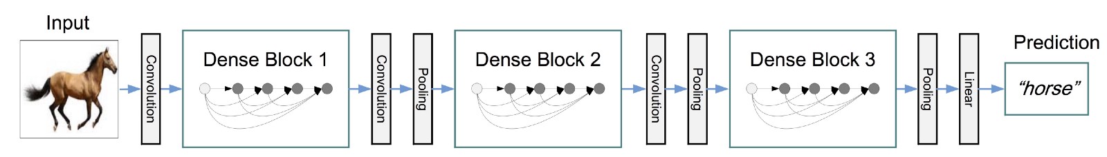 series of blocks, each of them = feed-forward network of a few layers with dense connections between layers (i.e. each layer receives information from all previous ones in its block)