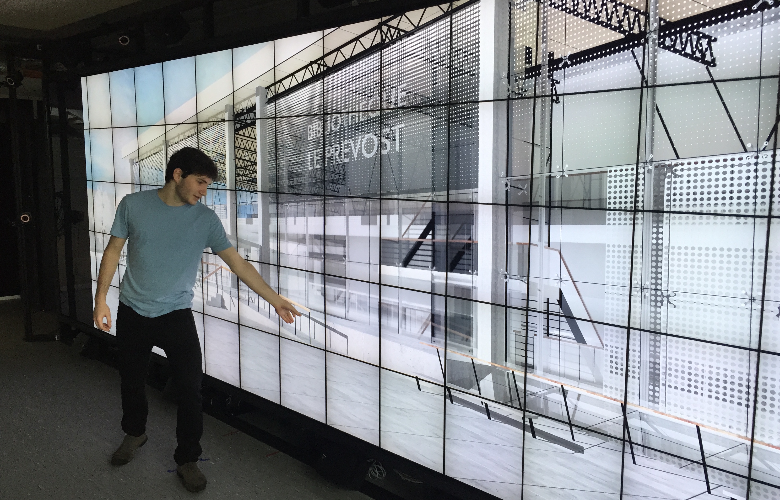 Type: Glass screen (4m x 3m) with stereoscopic back-projection 4K@120Hz, motion tracking, interactive tables, graphic rendering server (1TB of RAM, 2xK6000).