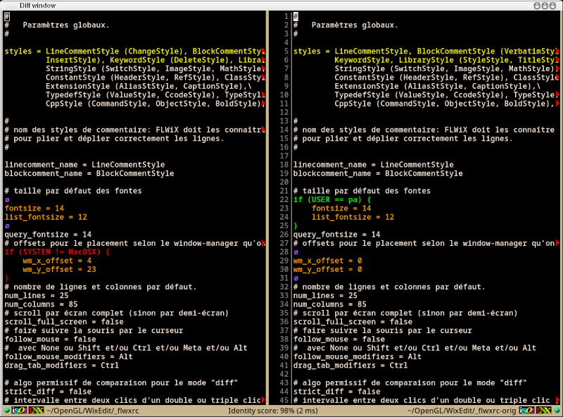 These colours are the default values for four styles: ChangeStyle, InsertStyle, DeleteStyle, and SameStyle. These styles must be aliases for the four first declared styles. The Diff mode can be redefined in the configuration file (it is in the default flwxrc). Notice that it is the only mode that do not derive from the Fundamental mode.